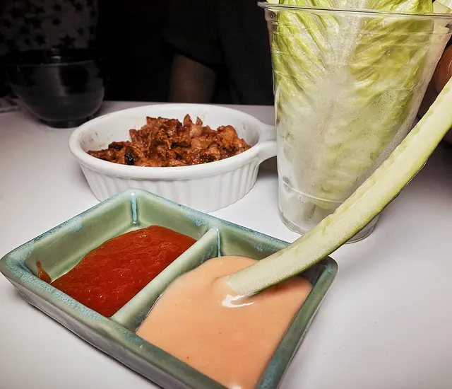 光看這肉就覺得口水流下來, 有附兩個醬, 分別是千島醬和另一個叫歐巴醬 ( 哥哥醬? ) ( 有看韓劇應該聽過歐巴這詞? )
