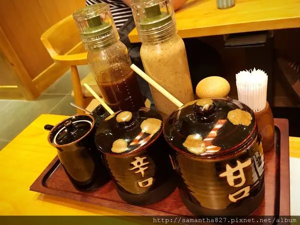 桌上備有胡麻醬、和風醬、甘口和辛口的豬排醬、邁泉特製香料鹽、醬油、芥末醬