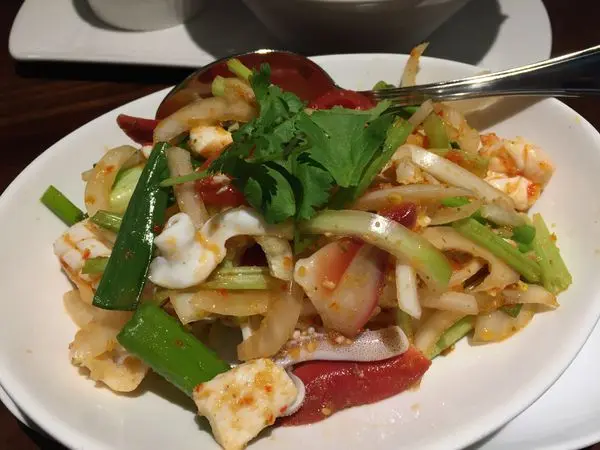 裡面有花枝、蝦仁、魚片、北寄貝加上洋蔥、芹菜、小番茄、辣椒再用醬汁調味
