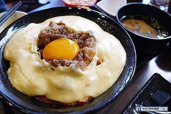 附上一大碗的牛奶起司熔岩醬,建議趁熱倒上丼飯口感最好。