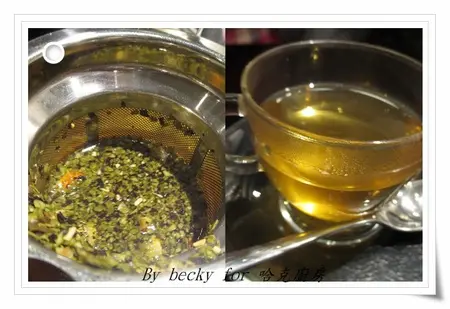 朋友的甜橙瑪黛花茶裡有甘草、橙花及橙皮等,瑪甜黛茶在印象中是可以抑制食慾的,倒入杯中有著淡淡的橙香,入口後有著甘甘的口感,入喉後有著橙汁的味道,朋友說味道很特別。