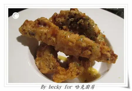 店家把雞柳條先醃漬入味後再裹上特製的酥炸粉去炸,夾一條雞柳條來吃,咬一口,外酥內軟,味道很香濃,而雞肉的肉質很鮮嫰,還包留肉汁在其中,上頭淋著蜂蜜芥末醬,吃起來略甜,與雞柳條很搭配,而上頭也灑有百里香及少許的胡椒,不會油膩,整道吃起來非常開胃。