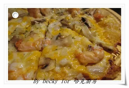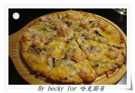 這個薄餅裡頭有蝦子、蘑菇、洋蔥、蒜頭及二種起司;蝦子很完整很大隻,味道很鮮甜,搭配上洋蔥的甜及二種略甜鹹的起司,咬一口還會牽絲,裡頭加入蒜頭,所以還有些微嗆的味道。