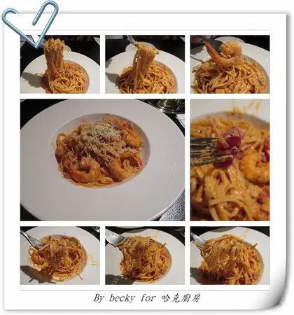 這道主食裡頭有蕃茄、洋蔥、起司及鮮蝦等,店家真的很貼心,方便客人吃食,所以每一隻蝦子都去殼且很大一隻,麵條是細扁麵,與蒜頭及奶油的混合,吃起來軟硬適中,裡頭蒜味很重還帶些微辣且還有黑胡椒的味道,不過卻不會很膩,很好吃,很推薦這道主食。