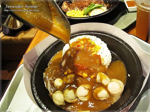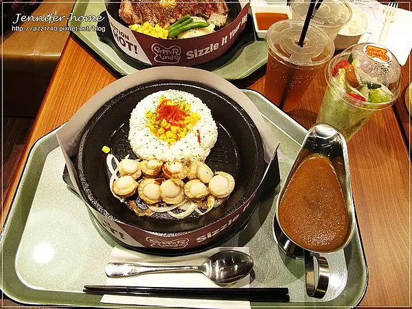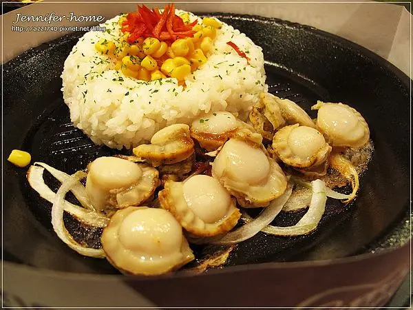 採用醬飯分離,熱燙的鐵盤上有一大碗的白飯上面還有配色的玉米粒和紅椒絲加上主角9顆胖嘟嘟的大干貝