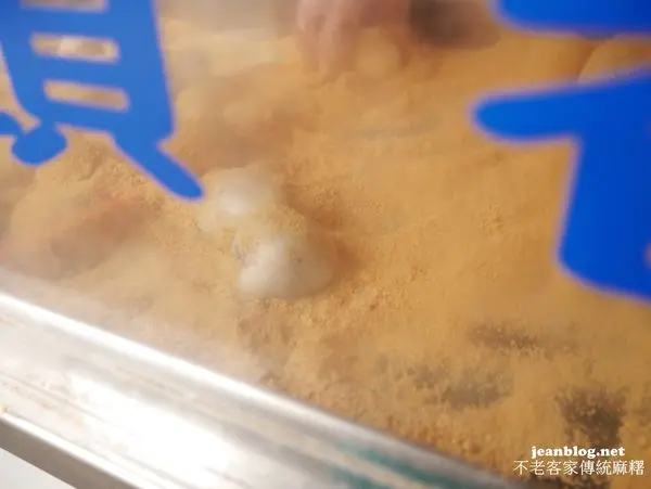 裝盒後還會鋪點花生粉在麻糬上會落入盒子底部