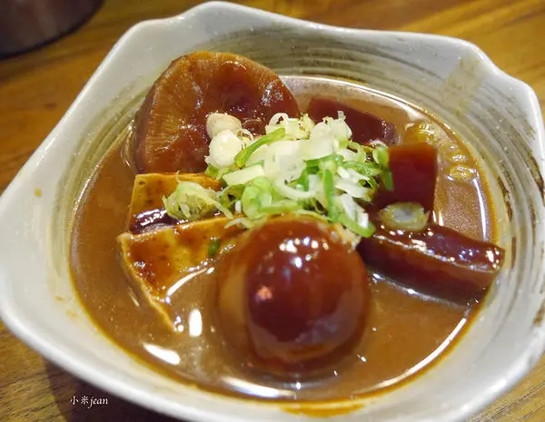 醬汁呈現焦亮的光澤感,這碗煮物裡有百葉豆腐、蛋、蒟蒻、大根(白蘿蔔)