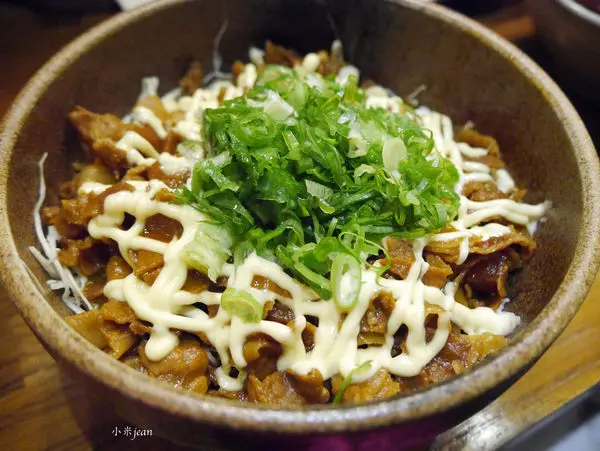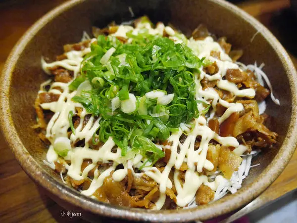 將美乃滋與豬肉片 蒟蒻 青蔥末 白飯一同拌開 這一碗裡融合了醬色 白飯的白與青蔥的綠