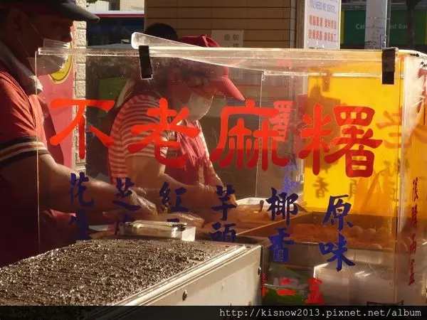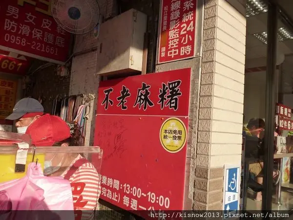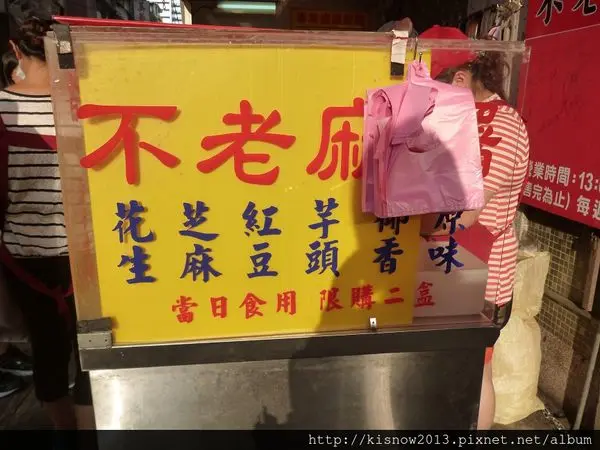 這裡真的很多人排隊,其實它只是一個小攤位,原來它是"不老客家傳統麻糬"的所在地,這次真的是因緣際會,本來天氣很炎熱,尤其下午必須頂著熊熊的烈日排隊,我內心真的很掙扎,懶惰和美食一直像天使和魔鬼在我的內心辯論,終於美食這一方勝出,我撐著陽傘在高溫超過35度C的大台北,耐著性子和一堆人擠在一起排隊.