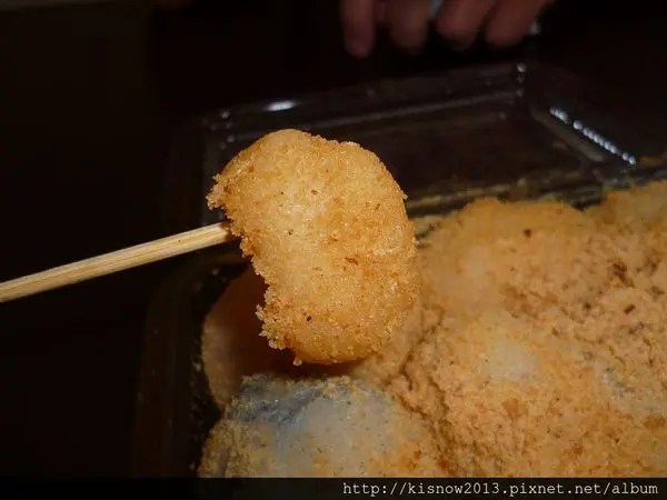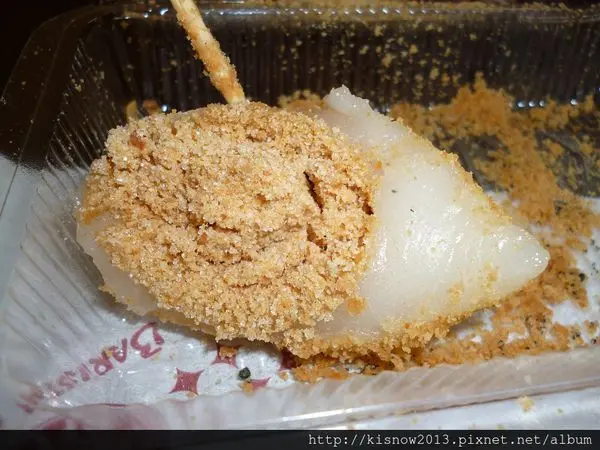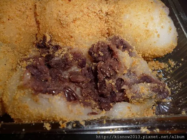 包著紅豆內餡的麻糬,整個体型看起來很飽滿,麻糬的質感除了沾黏性,還有延展性,很難用筷子或湯匙把它切開,吃起來的口感,經過咀嚼麻糬帶著花生滋味和香氣,質感的沾黏性化成口中的韌勁,因為紅豆內餡的關係,口感稍微偏甜.