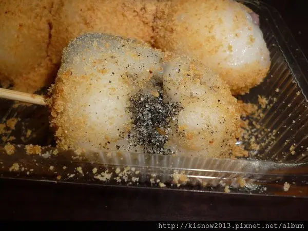 麻糬內餡是黑色芝麻粉,仔細聞起來有芝麻的香氣,吃起來的口感,除了延續麻糬質感沾黏的韌性,內餡的黑芝麻粉顆粒相當細,混合一點白糖粉,帶有芝麻濃郁的香味,甜度算是適中.