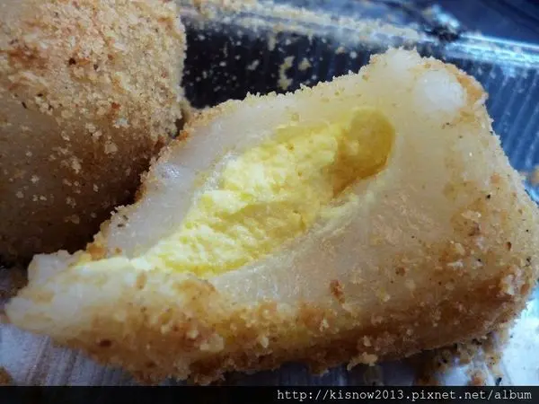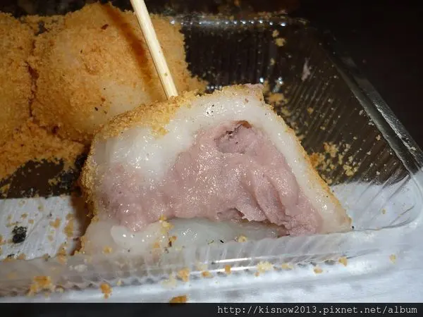 包著芋泥內餡的麻糬,可能因為太飽滿,芋泥餡不小心露出來,麻糬口味大部份常見的是芝麻,花生或紅豆,芋頭麻糬算是創新的口味,狠狠把麻糬咬下去,吃起來的口感,芋泥甜度適中,沒有想像中的甜,而且質感細膩,再加上麻糬外皮沾黏的韌勁,整体口感可以說是甜而不膩,這款口味的麻糬也是我的最愛.