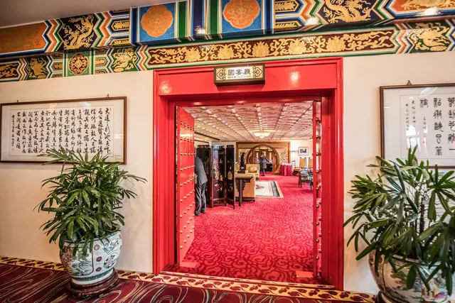 來到地下一樓東密道的入口處有平面圖,往下走可通往『孔二小姐故居』,孔二小姐是圓山大飯店第一代總經理孔令偉小姐,孔令偉人稱孔二小姐,東密道入口處門前古色古香的金色龍鳳裝飾,如果不是東密道的字樣,完全看不出來這裡藏著密道!