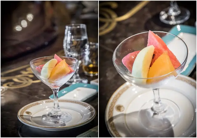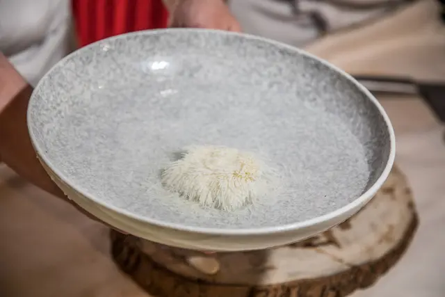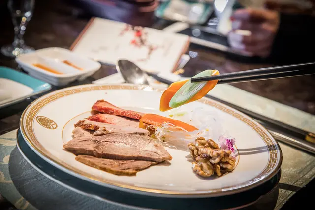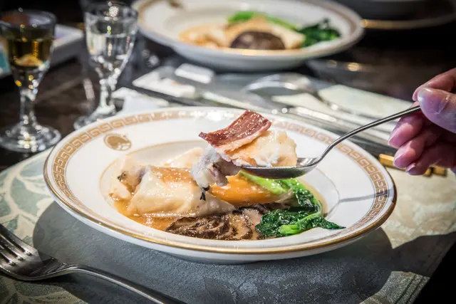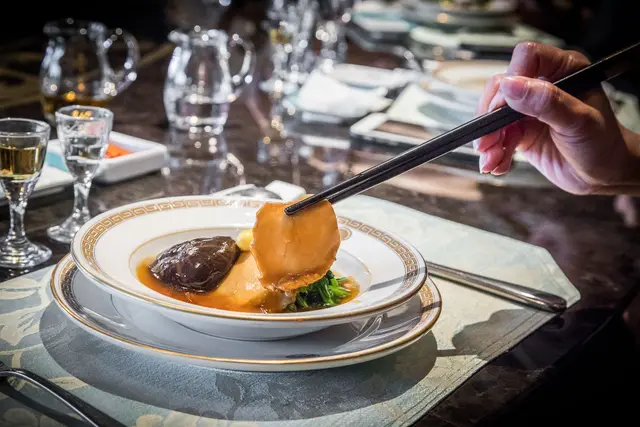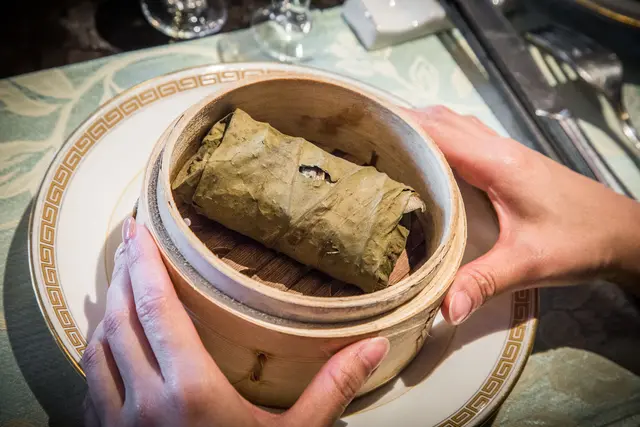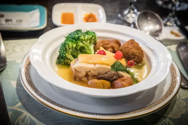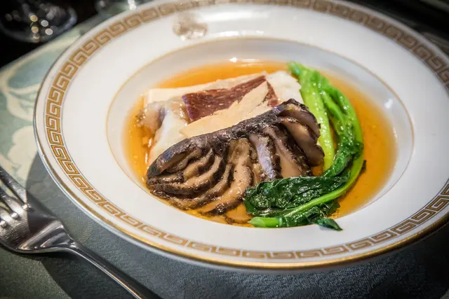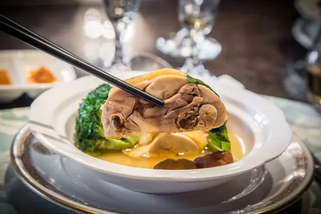 金華火腿可是宋朝時的貢品,於御宴時出現,廚藝團隊運用麒麟作法,將石斑魚切片與金華火腿及北菇同蒸,可品嘗到豐富的口味,也展現出國宴在選擇食材上給予的尊榮,魚肉吸收了食材精華,肉質細嫩,味道鮮美