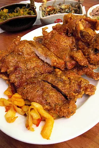 配菜一直在重覆的排骨飯...........這塊排骨因為是才剛醃的新的一批,所以還有肉汁,但皮還是炸得硬了些~~不像從前那麼酥脆的~~