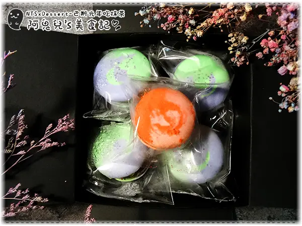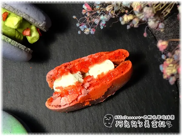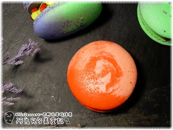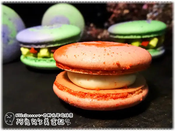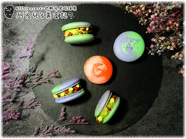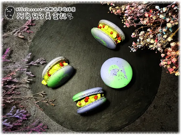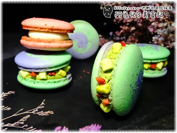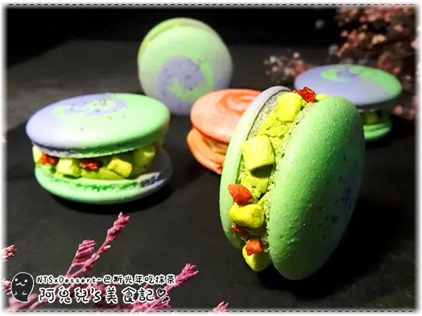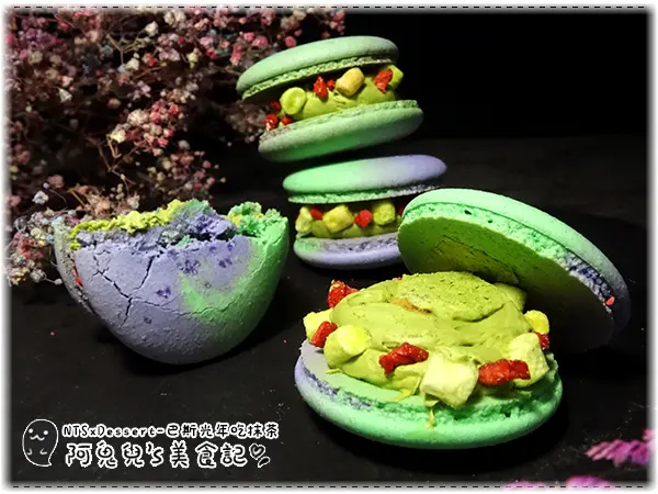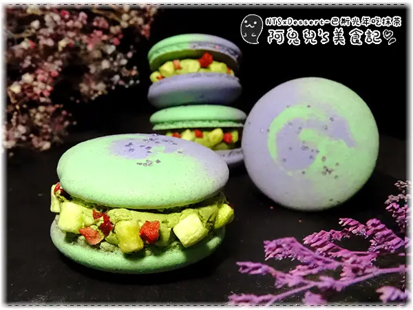 「NTS x Dessert」的馬卡龍外殼都使用杏仁粉製作,並混成紫綠炫彩