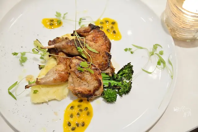 bbq風味鵪鶉、青花筍、洋芋泥、百香果、山蘿蔔苗 $520元