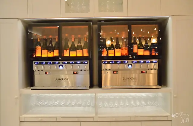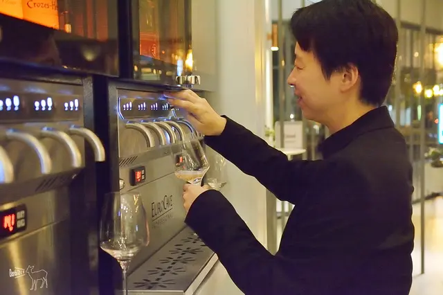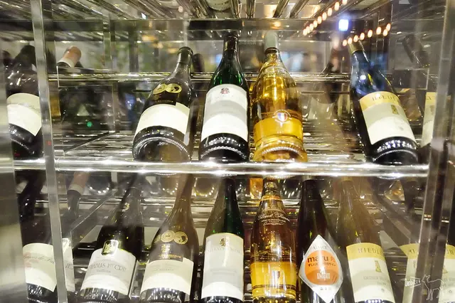 長桌的一旁為侍酒機,ACHOI當代料理餐廳內有侍酒師,可依照顧客的喜好以及所點選餐點,搭配適合的酒飲。我覺得非常貼心的是,酒飲容量有30ml、60ml、120ml以及單瓶的,若是喝不多,或是想淺嚐多種口味的客人就可以選擇30ml,價格從60元起跳,看來吃飯搭個餐酒也讓荷包變得格外輕鬆。