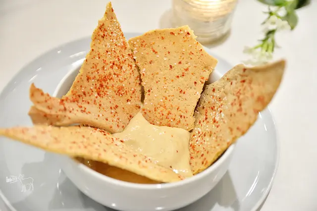 餐前提供的麵包餅乾很有趣,將蓮花餅乾製作而成,吃起來很脆,外皮微辣感,但由於表面我個人覺得較鹹,所以我比較喜歡沾著底部使用新竹福源花生醬製作而成的花生奶油醬,香甜味較能中和鹹味感。