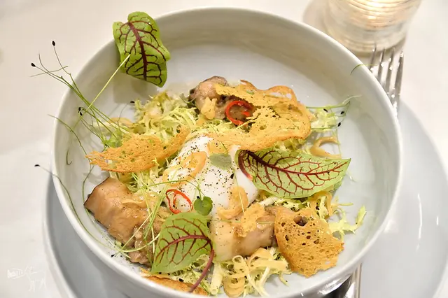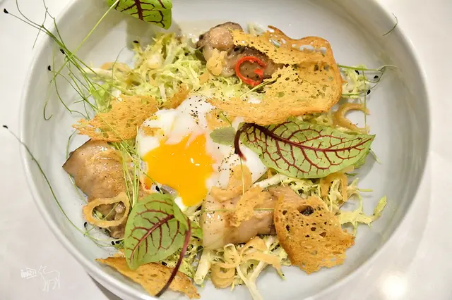 林明健主廚說此道經典料理是以培根為主,他改以台式的五花肉詮釋。綠捲鬚、茴藿香、紅酸膜還有半熟蛋與豬五花,整體很清爽,雖然有滷豬五花肉,可不膩口也不會過鹹,蛋也很滑嫩新鮮無蛋腥味,上方的脆片能更脆口就更添美味了!