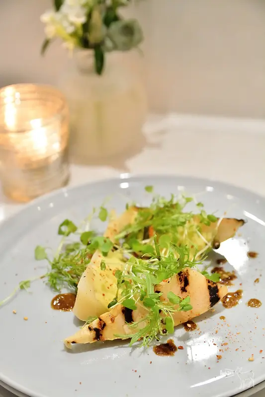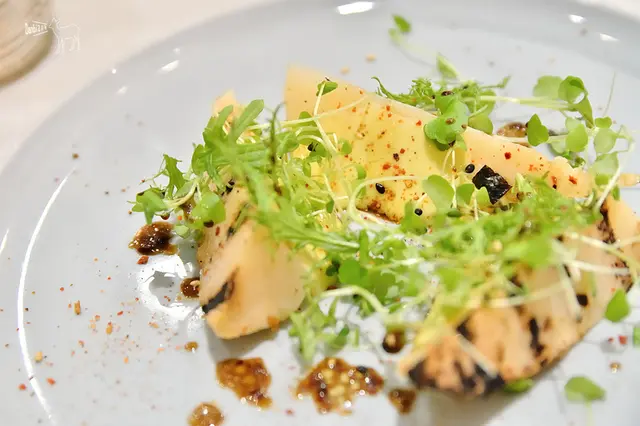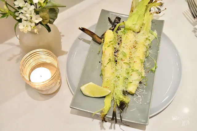 常在日式居酒屋見過與吃過烤玉米筍,但倒是第一次吃到結合起士、辣椒與萊姆的方式,主廚說這道是墨西哥或南美很常見的烤玉米筍料理方式,而台灣的玉米筍很嫩甜,他想運用結合。