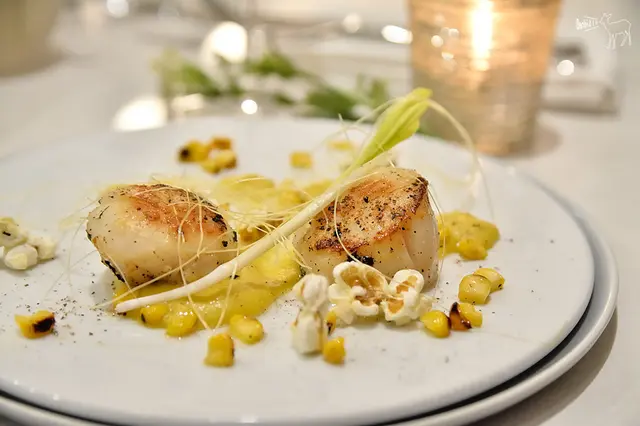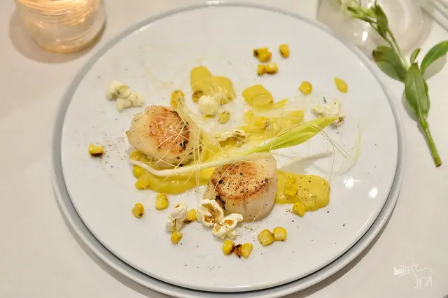 煎干貝、甜玉米油醋醬、迷迭香風味爆米花、玉米鬚、玉米苗 $620元