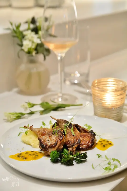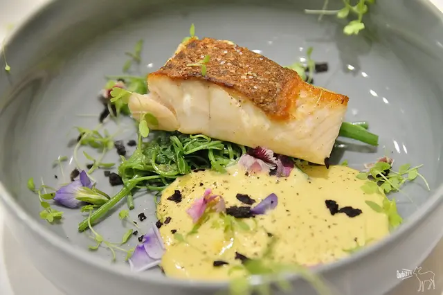 平時不大食鵪鶉肉,不過此鵪鶉肉煎的香,肉質嫩中又帶點緊致感,同桌另一位用餐者說,他以前吃過法式料裡的鵪鶉肉有點野味,但這裡的沒有。下方的青花筍焦香的好吃,洋芋泥綿密,百香果則能增添點風味與清爽果香,而山蘿蔔苗,主廚說會可增添點類似茴香的風味感。