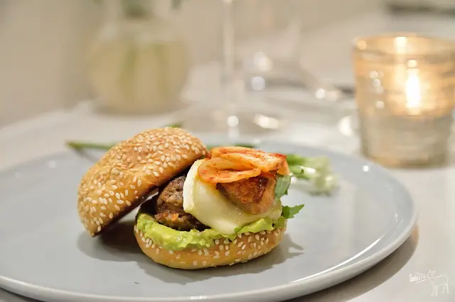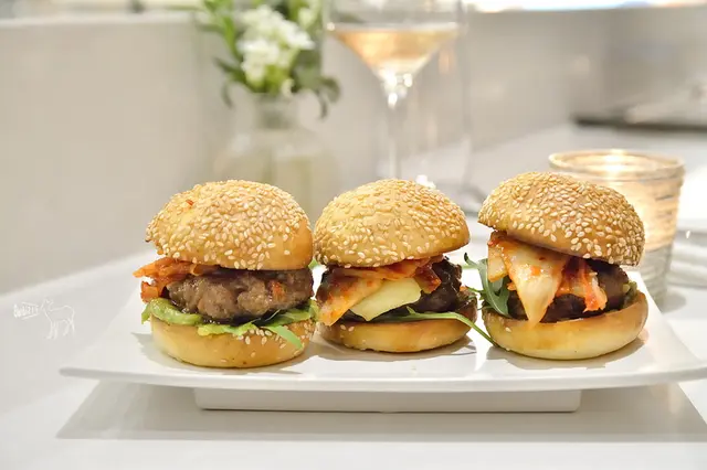 漢堡麵包烤的香脆,滿滿的芝麻讓咬在口中香氣濃郁。漢堡肉是使用牛臀與牛腩部位的牛肉製作而成,口感軟中又帶緊實感,自製韓國泡菜酸味適當不會過嗆,酪梨則能讓這一些取得圓潤口感與風味。