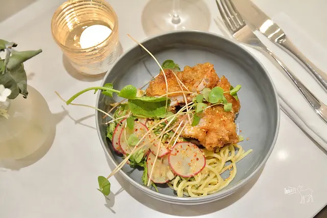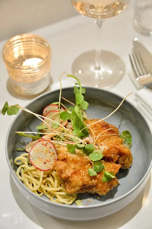 這道菜是主廚將台灣經典且多人喜愛的小吃炸雞與涼麵結合,有趣的是麵體竟是ACHOI當代料理餐廳廚師自製的,將義大利麵粉加入許多雞蛋與少許橄欖油製成,口感Q彈。涼麵的麻醬很清爽,另外搭配的蔬菜是蕎麥苗與櫻桃蘿蔔切片。