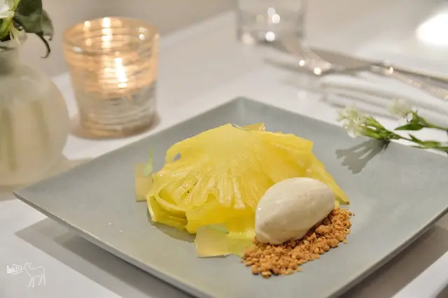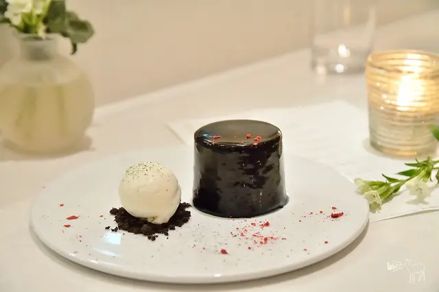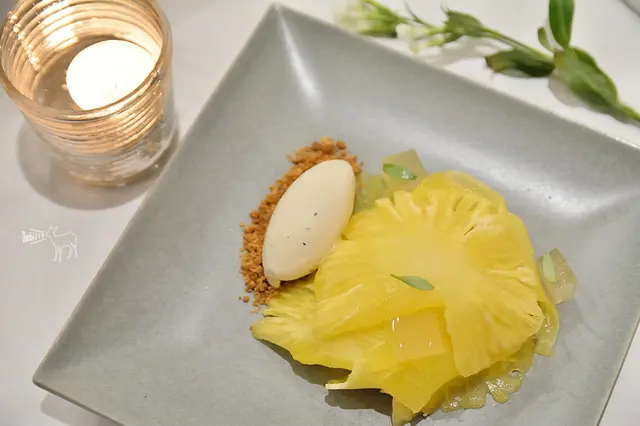 這道鳳梨甜點是我當日滿喜歡的一道,喜歡的原因在於將熟悉的鳳梨變的很雅致且多風味,而且不會刮舌。冰鎮的鳳梨薄片有薑味與原味兩種,一旁的是自製黑胡椒冰淇淋,本以為薑味鳳梨與黑胡椒冰淇淋會很突兀,沒想到還挺合適的!鳳梨下方襯著的櫻桃白蘭地cream很清爽又香且不甜膩,依照甜點師傅建議將其與黑胡椒冰淇淋、鳳梨等攪拌一起食用,一整個很滑順且風味層次多。