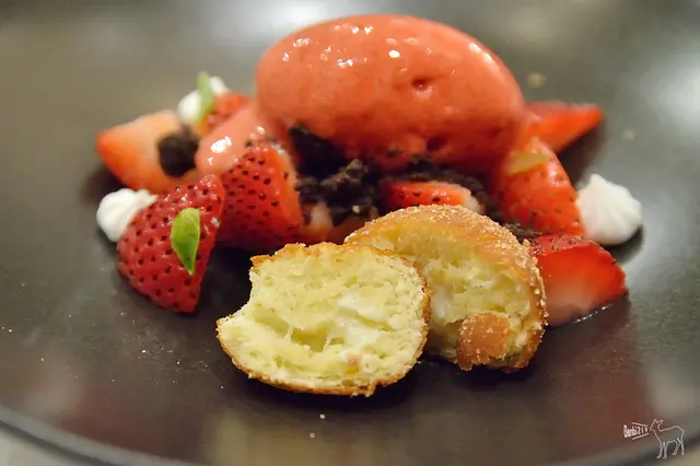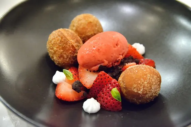 草莓蘿勒雪酪的口感細綿,草莓味濃郁好吃,一旁有新鮮草莓以及脆口的蛋白糖霜餅。肉桂甜甜圈的肉桂味很濃郁,裡頭有包馬斯卡彭起士,不過若是肉桂甜甜圈是熱的話,也許口感會更加濕潤,整體也會更加不錯,不知日後會不會更換為熱的甜甜圈。