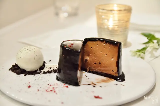 薄荷雪酪冰奇梨非常清爽細綿,使用法國米歇爾巧克力製成的幕斯非常濃郁滑順,而且無添加吉利丁,所以口感很軟綿,這道也滿不錯的。