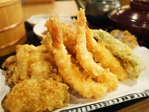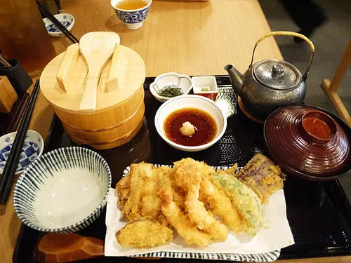 除了主菜炸天婦羅外整份套餐還附白飯、茶高湯及味噌湯