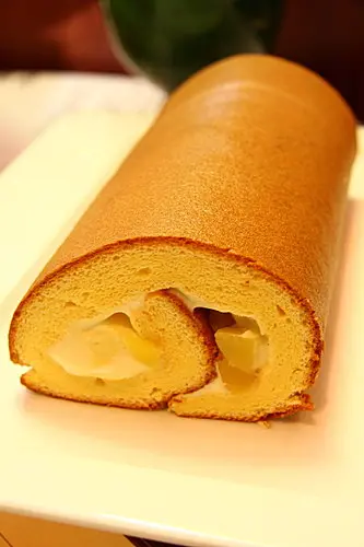 這就是每日限量銷售的小山卷,中間只夾了糖漬栗子和卡士達鮮奶油,他的蛋糕質地很綿密濕潤,吃起來有明顯的蛋香和蜜香,小山主廚說他的小山卷有「皮質」的感覺,果然那層表面的外皮,真的會閃著像真皮一樣的細緻光澤呢~~