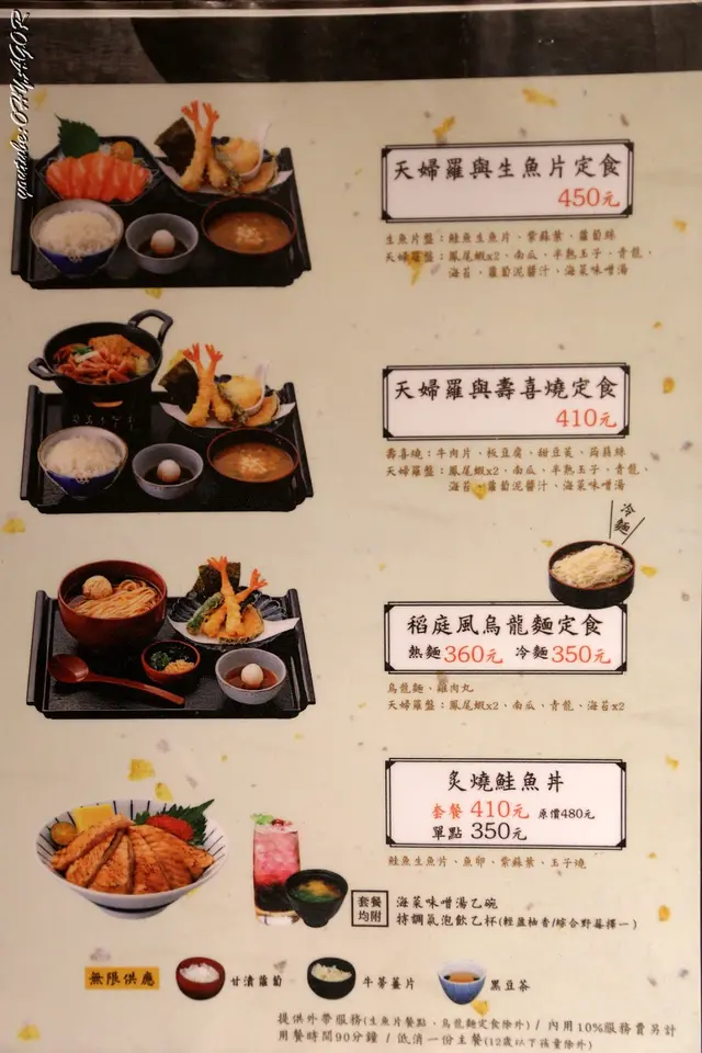 除了店內常見的丼飯還有生魚片 壽喜燒 烏龍麵 炙燒等多種新品