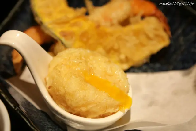 裡面有穴子 蝦 海苔 青龍 還有大量的干貝與一顆炸過的半熟蛋