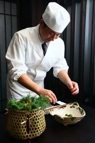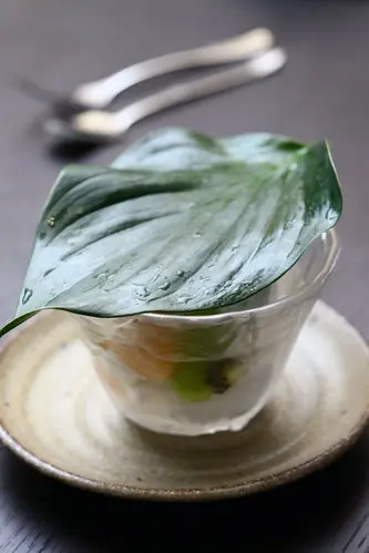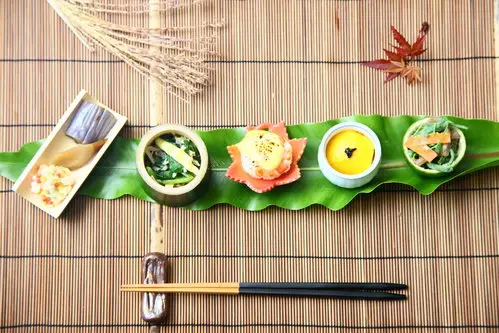 八寸旬菜是從大盤中,由客人自己拿取的,而那片山蘇葉是服務人員送上來當作八寸的「骨盤」,所以這張照片可不是米兒故意弄來一片山蘇拍照的喔~就連那楓葉和芒草,都是大盤上面的裝飾品喔!