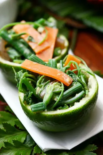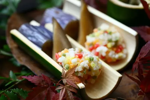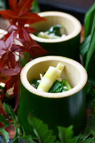 箭竹筍菠菜涼拌~用漂亮的竹筒盛裝,果然很自然~~