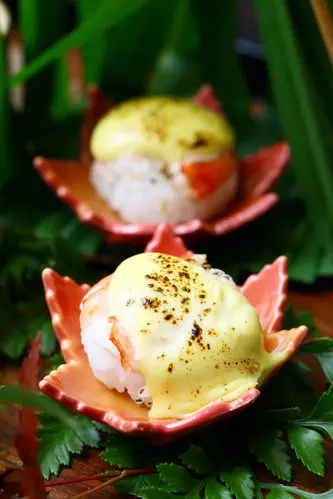 燈燈庵的料理概念,是走「自然流」,也就是會融進許多大自然的元素,並且結合在地食材入菜,不會一味強調日本進口,這也許是價格可以DOWN下來的原因之 一,像是米飯就選的是花蓮米,其他像是東北角的活龍蝦、台東飛魚等等,以強調真實原味的烹調手法處理,然後用充滿自然趣味的方式呈盤,所以第一道菜上來, 米兒就「哇」地叫了出來!因為服務人員端上來一盤裝飾了各式新鮮樹葉的盤子,上面是二人分的「八寸」旬菜,可惜米兒那時顧著拍盤子裡的小小碟子,忘了拍一 個全貌......然後整個就被我破壞掉了!有機會再去的話再補拍囉!