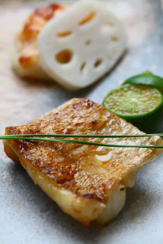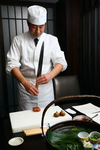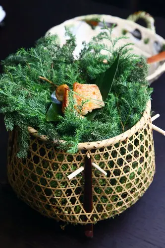 第二道秀菜,這是燒物-烤紅喉~其實另一張搶拍的照片有拍到這容器正在冒煙的!但是因為搶拍所以背景很亂。。。。。所以沒選那張放上來,其實這竹籠子裡面藏著木炭,所以端進來是充滿香氣的~