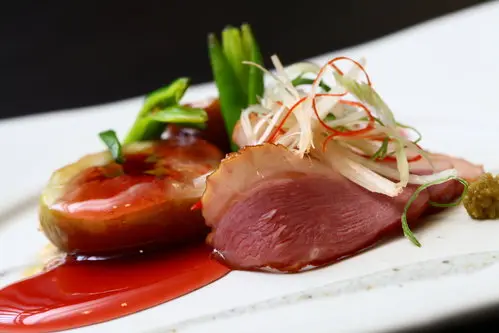 擺好盤的成品,超美的~~那鴨肉處理得恰到好處,淡淡煙燻味,肉質又很軟嫰,配上旁邊一點柚子胡椒吃,相當不錯~但最好吃的是那個加了紅酒醬汁的烤無花果~我的媽呀~底下還有帶著淡淡酒香的芝麻醬~吼~喔伊嘻的啦~~