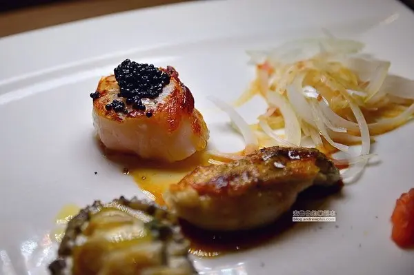 干貝上鋪上了魚子醬,吃起來干貝軟嫩中有甘甜,魚子醬提供了適當的鹹味,吃起來是很高級的FU