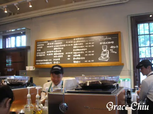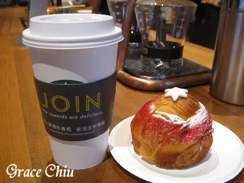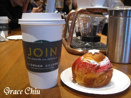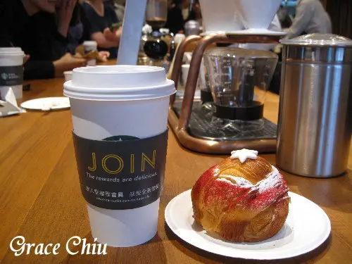 這間星巴克除了門市是以古蹟建築經營有特色外也是首間推出有虹吸式咖啡服務的星巴克,另外還與昂舒巴黎糕點合作提供精美的糕點,我點了一杯熱拿鐵(120元)還有芒果丹麥(90元).