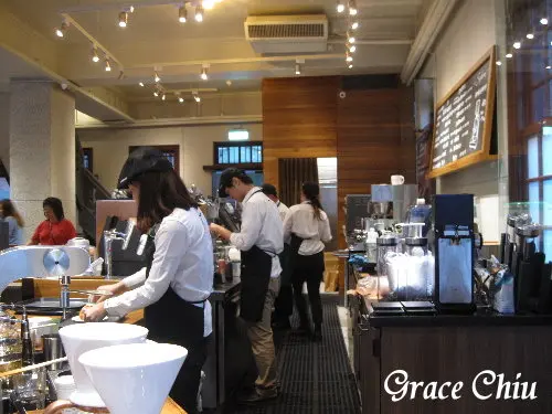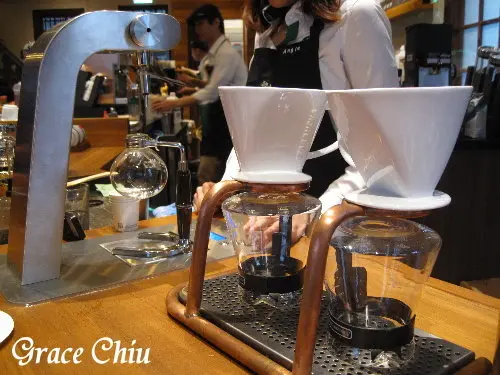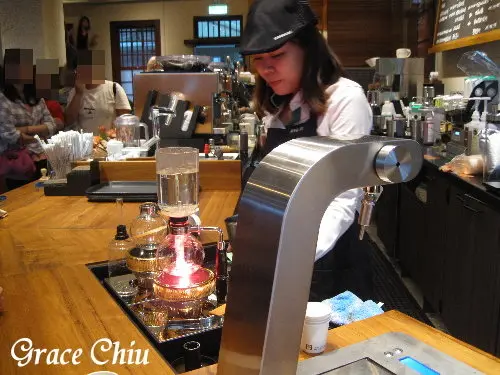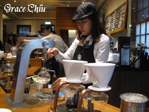 坐在吧台前喝咖啡吃甜點還能欣賞星巴克店員手沖咖啡的工作情形,星巴克的店員服務態度親切,一邊沖泡一邊解說操作過程,跟客人間的互動感覺良好.