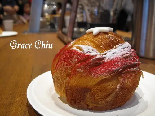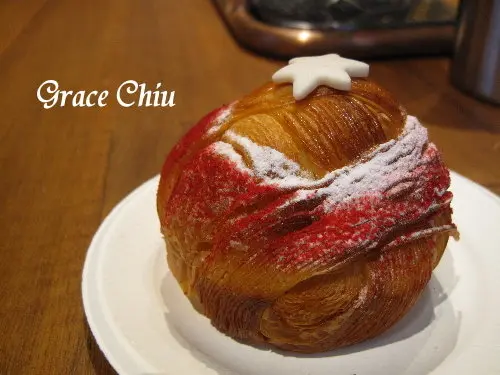 芒果丹麥~接近圓球狀的外型很可愛,上頭有一塊六角星白巧克力,外層紅色粉末是吃起來微酸的莓果粉~