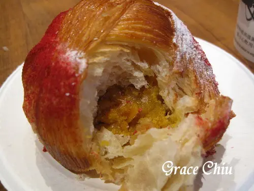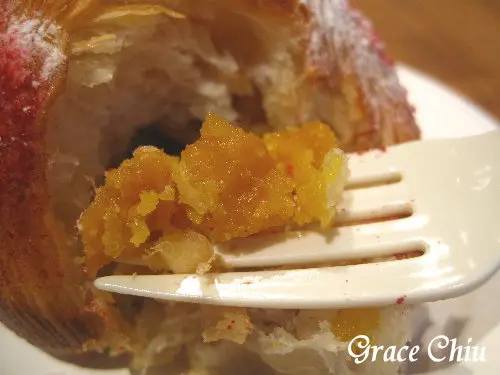 剝開帶有些脆度的外層,內部多層酥香,底層加有芒果餡,吃的到明顯芒果纖維,口感上感覺有點像在吃濕潤的厚塊芒果乾,整體味道很不錯.
