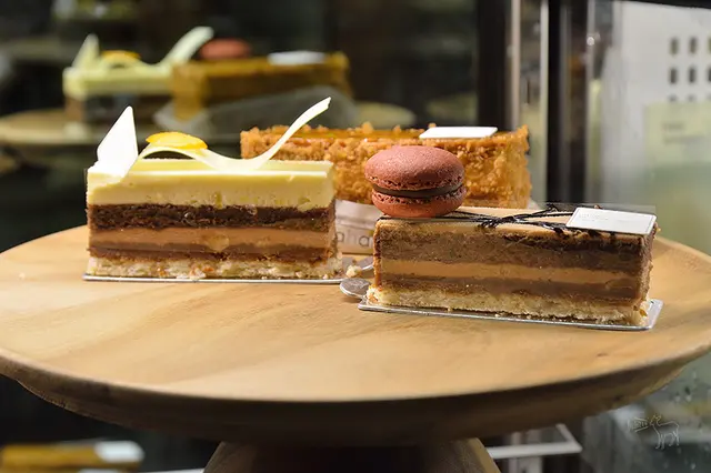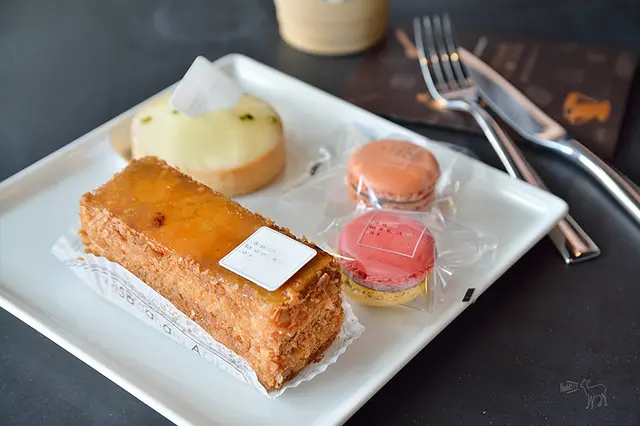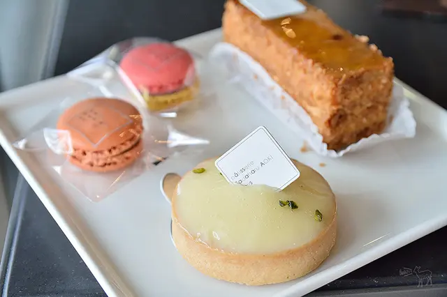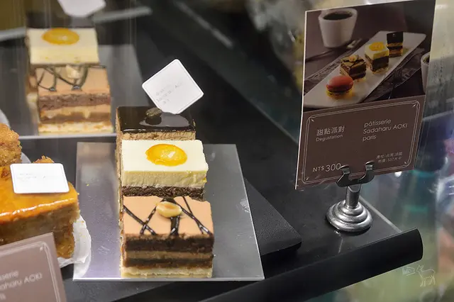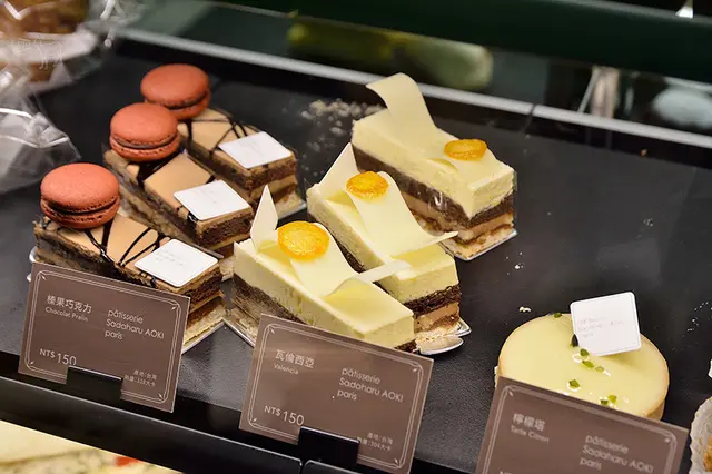 這裡販售青木定治的甜點有星巴克歐貝拉$150、榛果巧克力$150、瓦倫西亞$150、檸檬塔$150、香草千層派$200、馬卡龍$90元,份量不大,裝飾上較中規中矩。