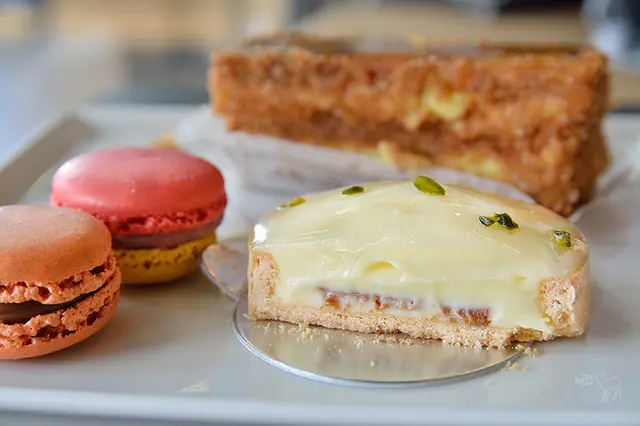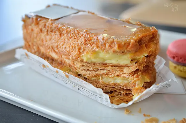 比起讓人失望的檸檬塔,這千層派還不錯吃,裡面是口感黏稠的卡士達醬,主要的焦糖來自表面那一層吃起來脆口的糖片,不過甜度有一點高。