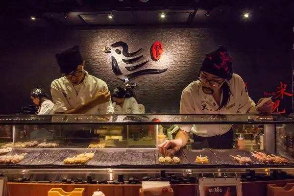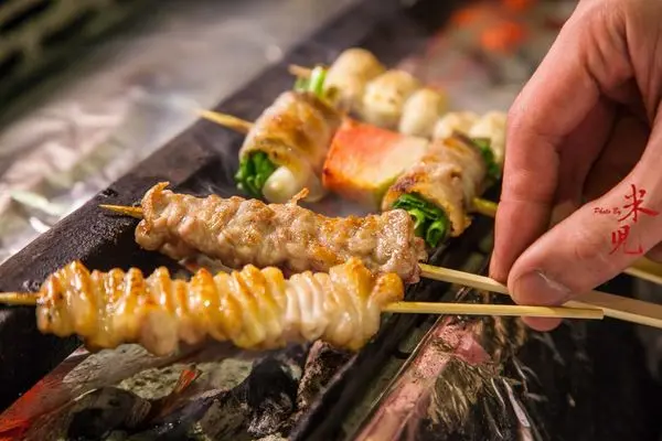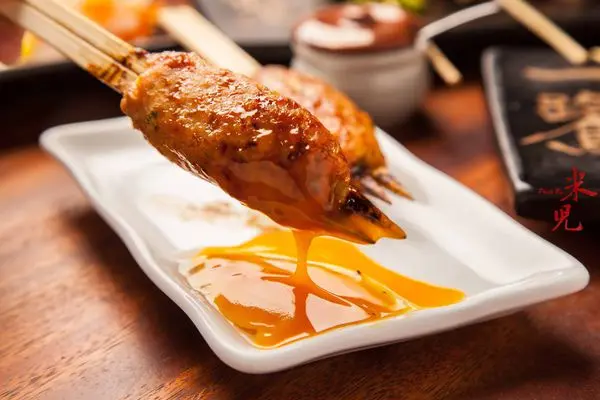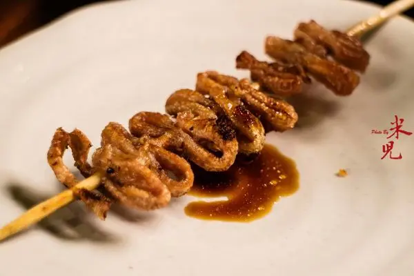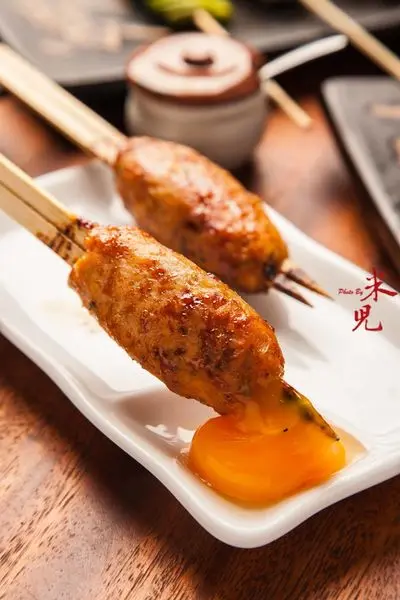 自家製雞肉丸,一串100大洋。分成鹽烤和醬烤二種,肉丸本身用雞腿肉、雞胸肉、雞軟骨、洋蔥、青蔥等等食材依特定比例調成,烤好後呈現外微酥,內多汁的口感。