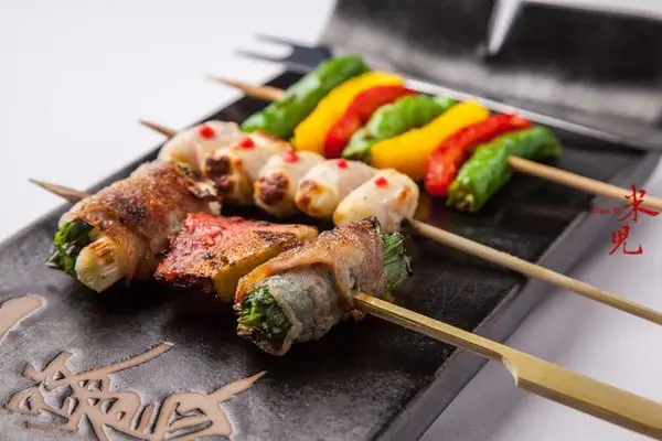 除了選材好,配色漂亮也是一鷺串燒最大的特色,烤好後擺在每桌上都會有的「公盤」上,看起來就讓人食指大動,這公盤是寫著一鷺的特別訂製版呢!最前面那串就是限定版菜色,是用豬五花卷著宜蘭蔥,中間搭配的則是紅芯芭樂!烤過後滋味獨特,非常好吃!